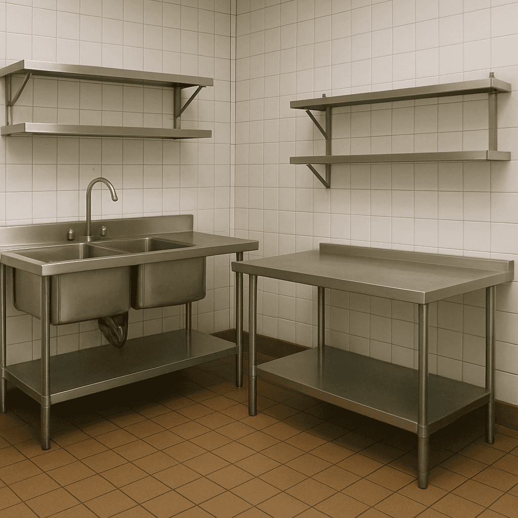 Incluye mesas de trabajo, estanterías, fregaderos, gabinetes, repisas, campanas, trampa grasa, muebles porta bandejas, escurreplatos, picadoras, molinos, exprimidores de jugo, licuadoras, rebanadoras, pesas industriales, amasadoras, sobadoras y mucho más, todos con acabados profesionales y adaptados a las necesidades de cada cliente. Ofrecemos opciones personalizadas con entrepaños, bordes curvos, rodapiés y accesorios para optimizar la operatividad y la higiene en cada ambiente de trabajo.
